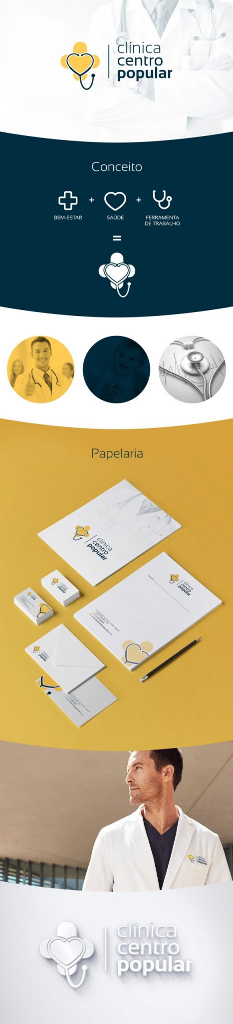 Um atendimento eficiente, rápido e humanizado esta é a mensagem pensada para elaborar o logo da Clínica Centro Popular. Foram usadas cores que se contrapõe mas a junção delas remete a personalidade da marca. O amarelo representa o otimismo e a alegria. O azul escuro é considerada uma cor estável e transfere boas sensações para o corpo e a mente. A simbologia se harmoniza com as letras de fácil leitura para representar o bem estar, a saúde e o bom trabalho. O foco central do estetoscópio formando um coração induz a característica principal da marca: a centralidade da vida na batida do coração.
