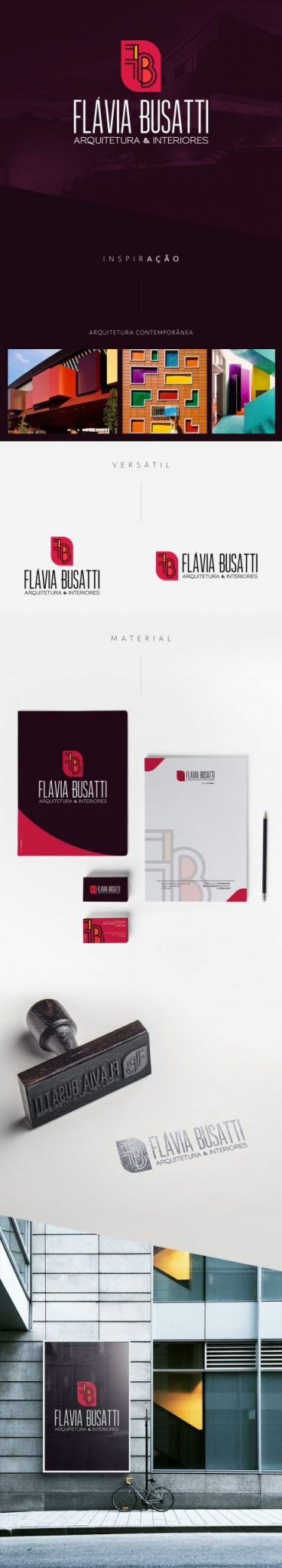 Buscando transmitir os princípios da arquitetura contemporânea foi desenvolvida a Identidade Visual da Arquiteta Flávia Busatti. As cores vibrantes realçam uma presença forte da marca e une-se com as tendências visuais. Os traços retos, usuais na arquitetura, compõe a harmonia com a escrita fina para formar um logo inconfundível.