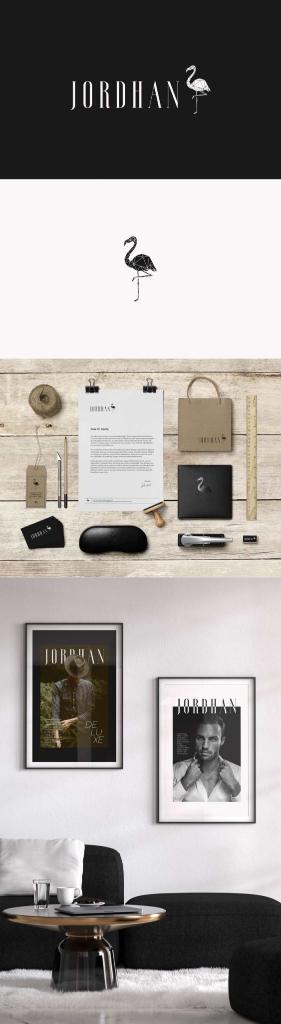 Por ser uma loja de roupas que tem por foco os trajes sociais, o desenho da identidade teve por objetivo transmitir um design fino e sofisticado. O Flamingo, símbolo da marca, foi escolhido para representar a elegância. No texto foi utilizado uma fonte alongada para acompanhar as pernas finas e longas do Flamingo. Por fim, escolheu-se as cores preto e branco para remeter ao luxo.